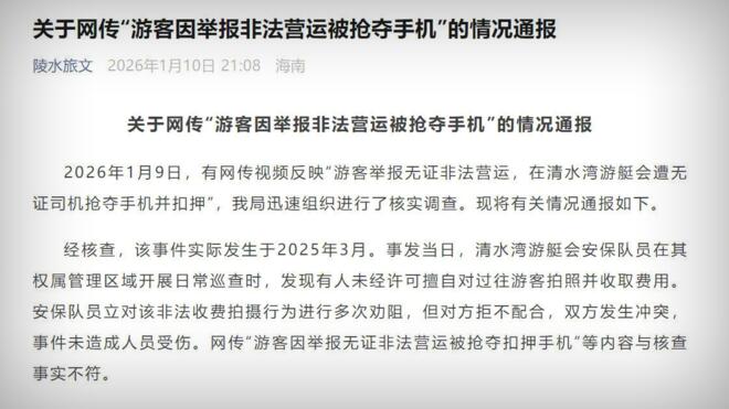 海南陵水通报:网传“游客因举报非法营运被抢夺手机”不实21:12