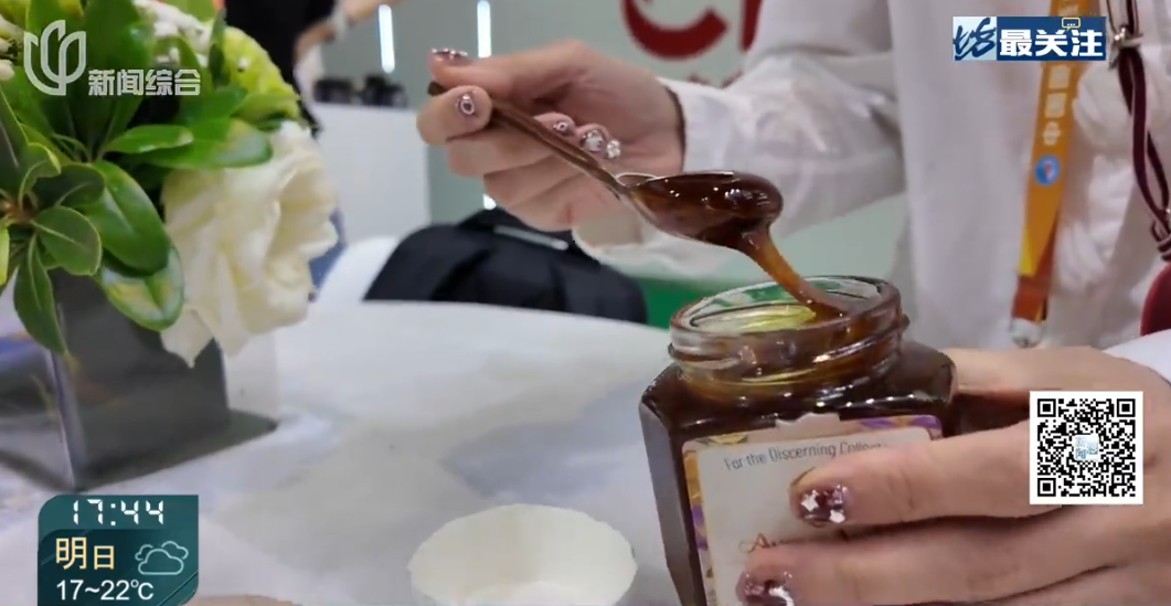 这也是进博会打开的第一瓶高级蜂蜜,现场打开就能明显感受到它的香味。从视觉上看,这款蜂蜜的质地更加厚实,颜色更黑,有点接近大家常吃的咳嗽糖浆。