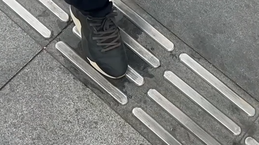 徐汇滨江的芒果广场内,就有一条约300米的不锈钢盲道,盲条虽有防滑花纹,但有缺失,部分盲道还被占用。👇