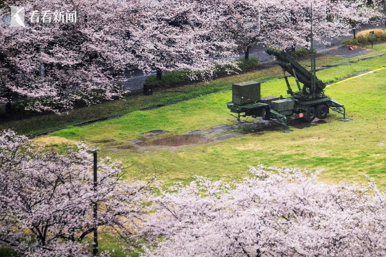 东京防卫省旁的樱花树下设置有爱国者PAC-3导弹发射器
