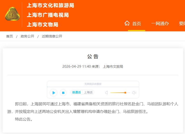 好消息!正式公告了!自4月29日起,上海居民可以去金门、马祖旅游了!只需通过上海市、福建省具备相关资质的旅行社,就能报名团队游和个人游,并按规定向两地公安机关出入境管理机构申请办理赴金门、马祖旅游签注。