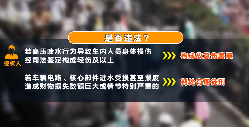 律师进一步解释,如果高压喷水行为导致车内人员身体受到损伤,经司法鉴定构成轻伤及以上的,行为人将构成故意伤害罪,依法追究刑事责任;若未达到轻伤标准,则需承担民事赔偿与行政违法责任。倘若车辆电路、核心部件因进水严重受损甚至报废,行为人还存在触犯刑法的可能性,若造成财物损失数额巨大或情节特别严重的,最高可判处7年有期徒刑。