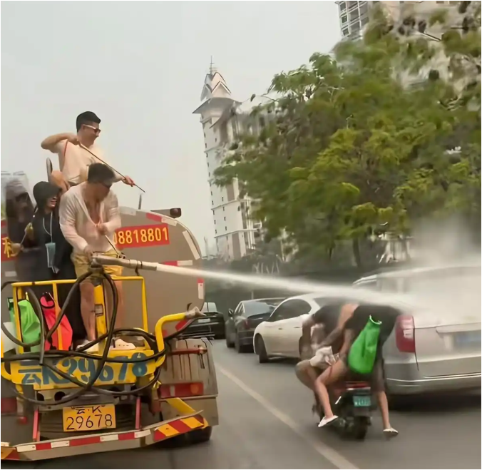 令人遗憾的是,这已经不是泼水节期间第一次发生“野蛮泼水”事件。网传的多段视频中,有两名驾驶电动车的女子遭到人群和高压水枪围堵,被困在原地难以脱身,处境十分狼狈;还有泼水者高坐在洒水车之上,使用威力巨大的车载高压水枪肆意喷射,路边无辜行人被喷得仓皇逃离,一名摩托车乘客甚至差点被水流冲倒在地,险象环生;更过分的是,就连贴着“警察执勤,请勿泼水”明确告示的执勤岗亭,也遭到人群恶意泼水,严重干扰了正常执勤工作。