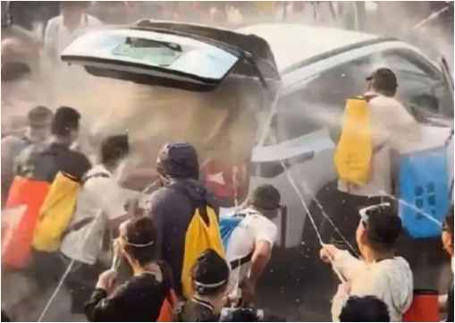据网民在社交平台发布视频反映,4月14日,自己和家人开车路过活动现场时,遭遇了极端滋扰:不仅车门、后备箱被人强行拉开,还遭到高压水枪的“野蛮”喷水,混乱的场面持续了七八秒钟,导致坐在后座的老人因突然被淋湿而受到严重惊吓,车内一度出现冒烟迹象。