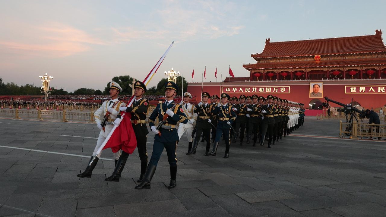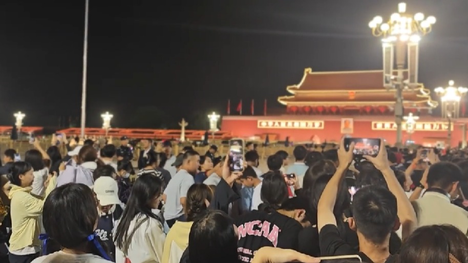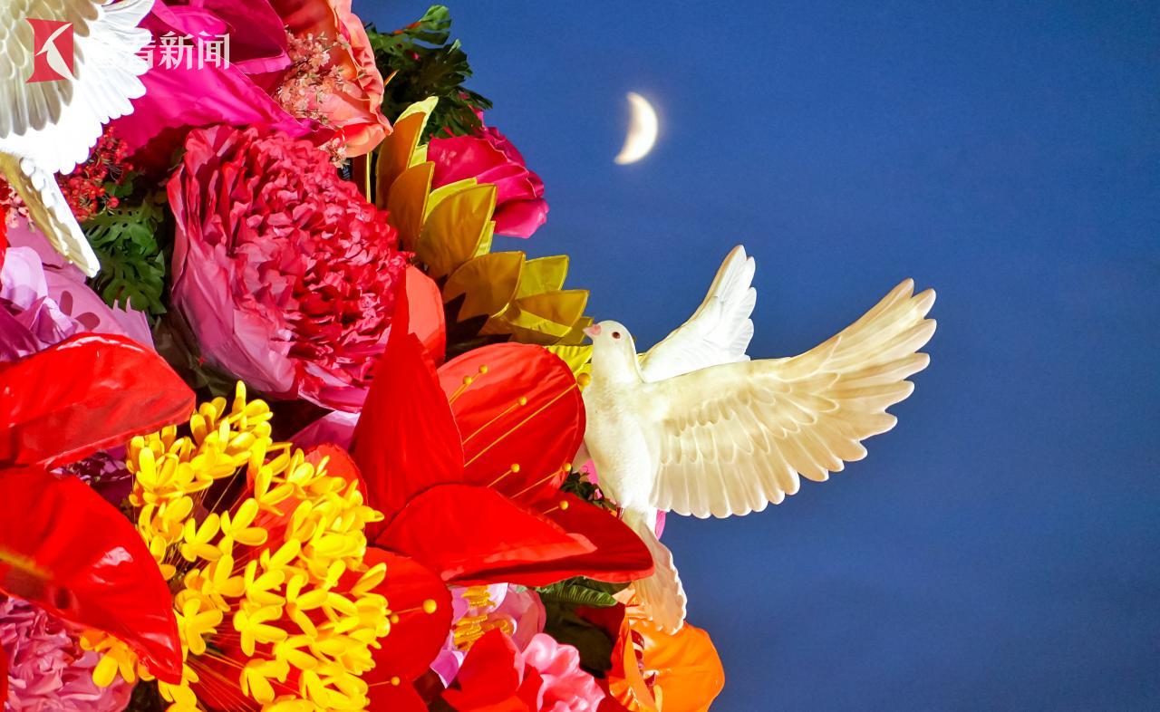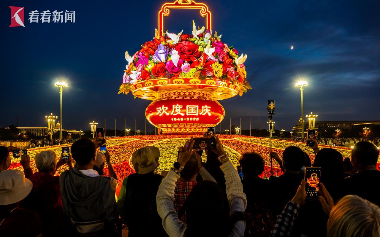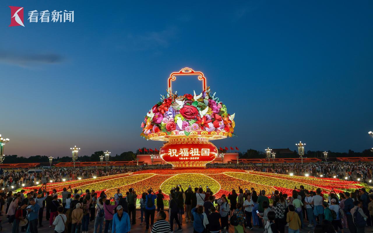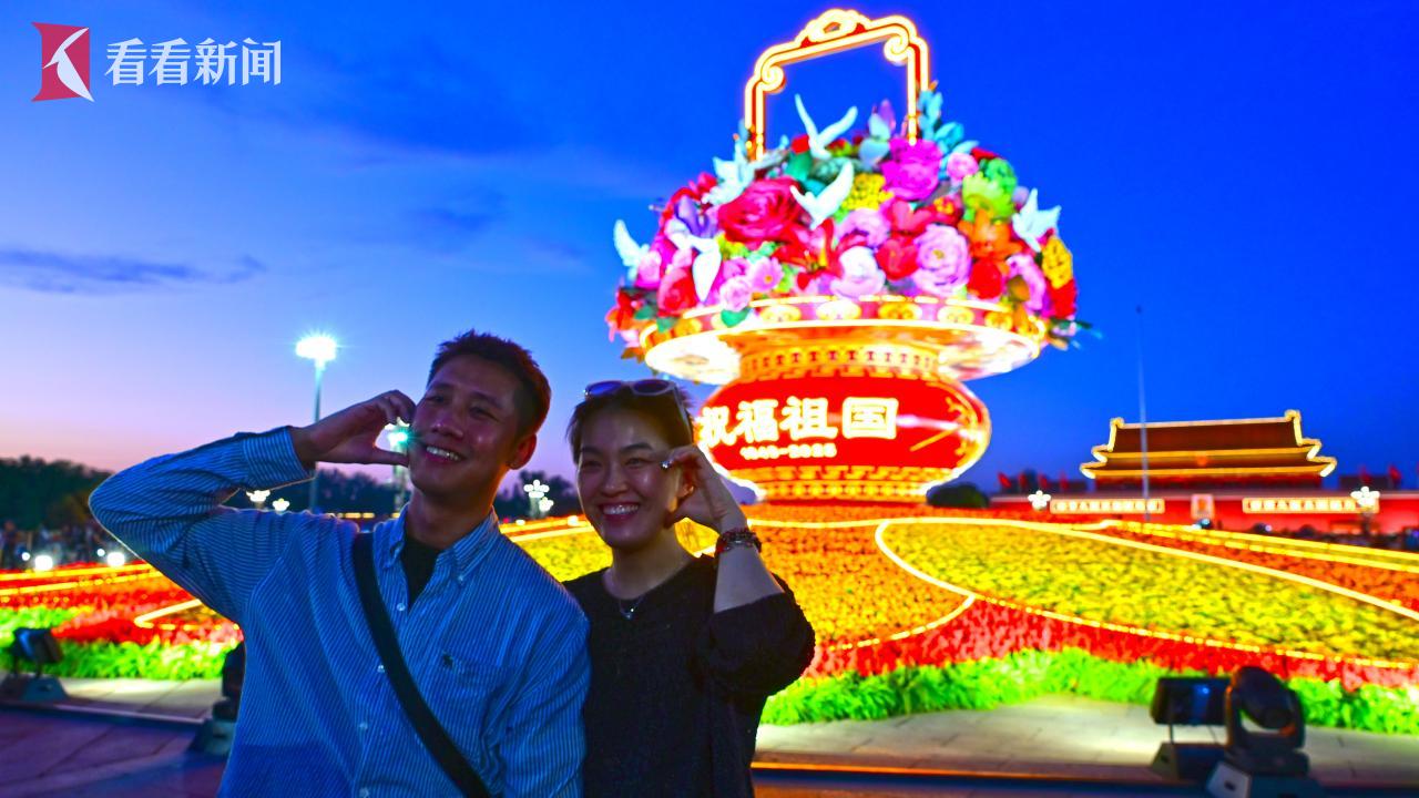 9月28日,北京夜幕降临,天安门广场国庆“祝福祖国”大花篮亮灯。灯光璀璨下,各地游客在大花篮前拍照留影,记录幸福生活,庆祝新中国76周年华诞。