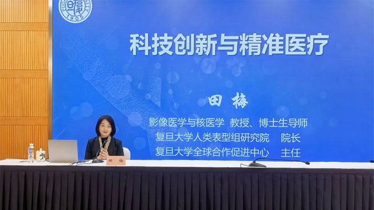 会议期间,特邀复旦大学全球合作促进中心主任、人类表型组研究院执行院长、教育部“长江学者”特聘教授田梅为大家作了题为《科技创新与精准医疗》的学术报告。