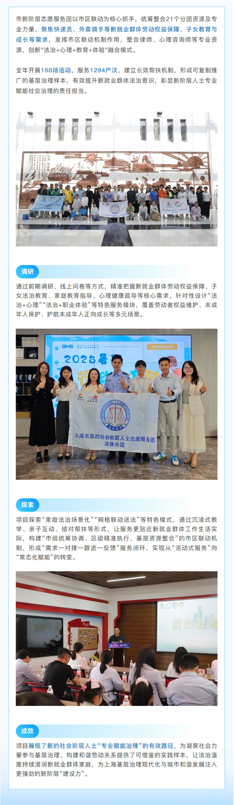 在市委统战部牵头下,上海市新的社会阶层人士志愿服务团“结对五百户新就业群体家庭开展综合普法服务”项目纳入2025年上海市法治为民办实事项目。详情→