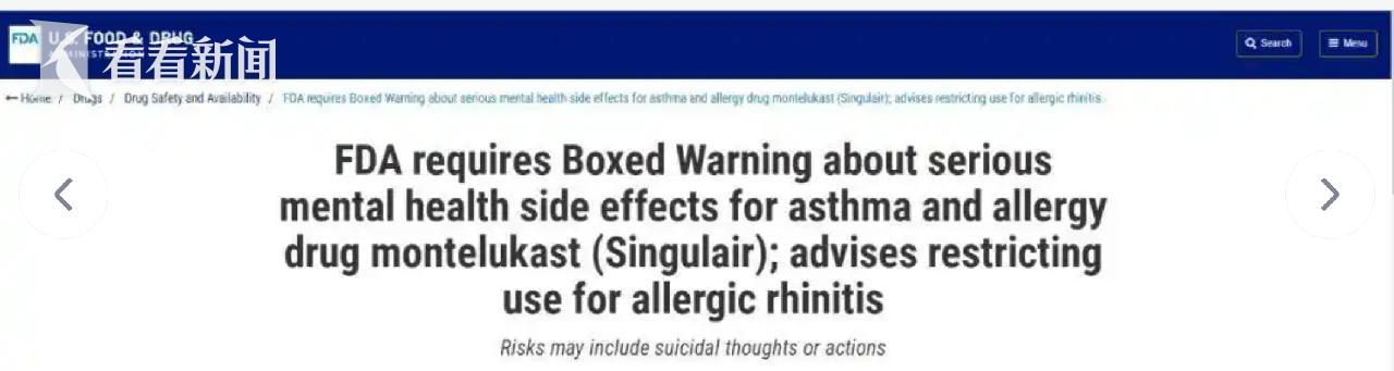 事实上,美国食品药品监督管理局(FDA)曾于2020年3月4日要求在该药品说明书中增加黑框警告,强调“孟鲁司特钠”严重精神科不良反应风险。以醒目的黑框标出,说明该内容的安全警示级别最高,目的是提醒医生和患者该药存在可能致命或极其严重的风险,也是提示患者要在用药期间密切观察情绪和行为变化。