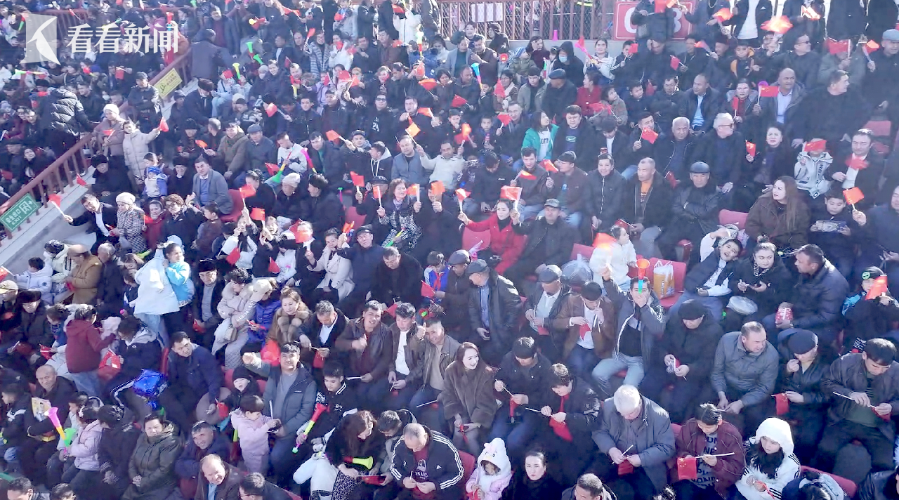 现场,无人机悬挂国旗巡场观众欢呼声响彻整个体育场。
