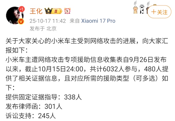 小米集团公关部总经理王化10月17日发文,就小米车主遭受网络攻击事件的援助进展情况进行了介绍,称自小米车主遭网络攻击专项援助信息收集表发布以来,截止到10月15日24:00,共计6032人参与,480人提供了相关证据信息,且对应所需的援助类型(可多选)如下:提供固定证据指导338人,发布律师函301人,诉讼支持245人。