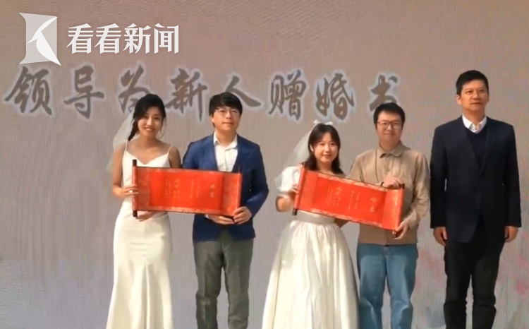 此外,不少预约结婚登记的新人,也收到了一份特别的结婚大礼,主办方为大家举办了一场融合传统与现代的集体婚礼。新人们登台展示才艺、分享爱情记忆。现场,书法家挥毫为新人们书写婚书,见证幸福时刻。