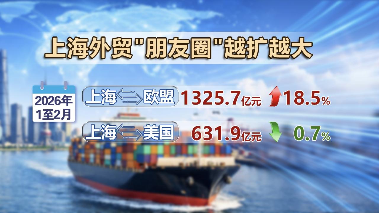 这背后离不开上海外贸市场的多元布局。贸易"朋友圈"的老朋友关系深化。前2个月,上海市对第一大贸易伙伴欧盟进出口1325.7亿元,增长18.5%。对美国进出口631.9亿元,出口降幅显著收窄至0.7%。
