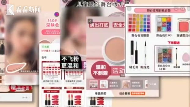 记者按照消费者提供的线索,在电商平台搜索儿童化妆品、儿童表演化妆等关键词,儿童舞台妆专用粉底,儿童舞台专用眼影,小女孩专用正红口红、儿童腮红、口红,各类标榜儿童专用的化妆产品种类很多,宣传图、详情页以及售后评价中也都明确显示,这类产品的适用人群就是针对儿童。儿童化妆品监督管理规定第六条明确规定,儿童化妆品应当在销售包装展示面标注国家药品监督管理局规定的儿童化妆品标志,业内将这种儿童化妆品专用标志称为小金盾。