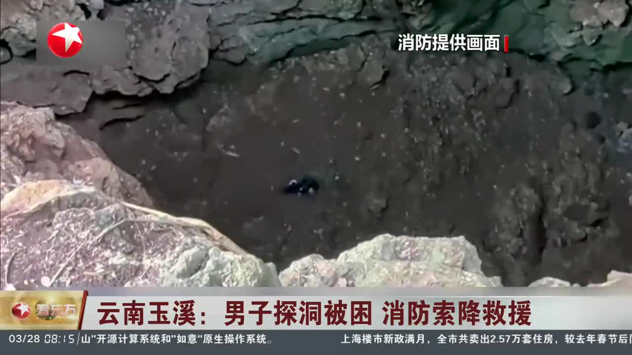 云南玉溪:男子探洞被困 消防索降救援
