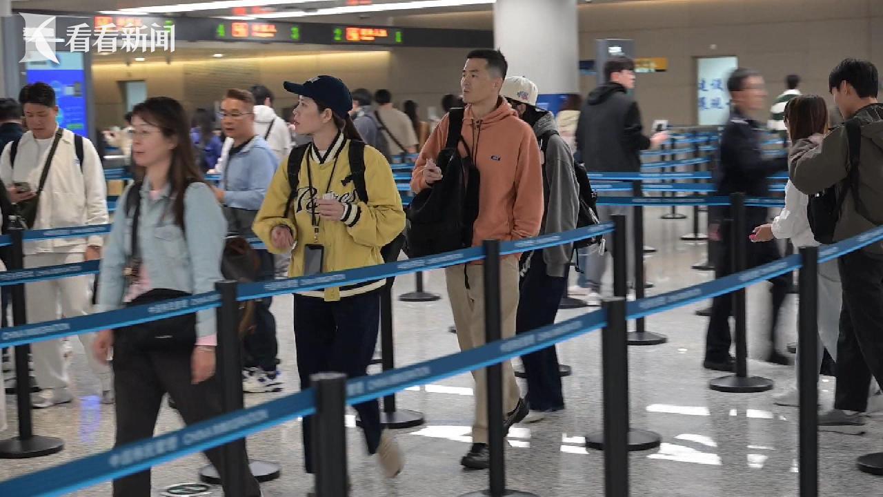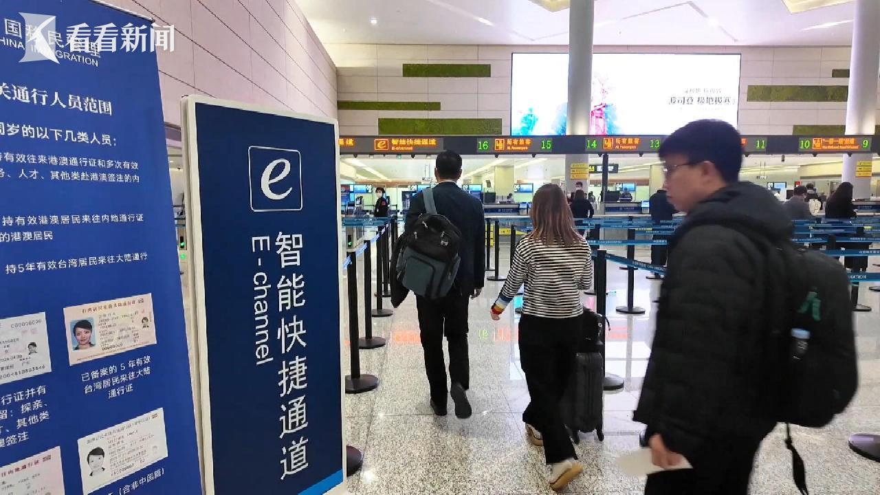 下午1点,虹桥机场边检查验大厅迎来入境客流高峰,其中有不少返乡祭祖的港澳台同胞。在快捷通道前,符合条件的港澳台旅客只需面向镜头,几秒即可完成通关全流程,无需反复出示证件,高效的通关体验也让港澳台同胞赞不绝口。
