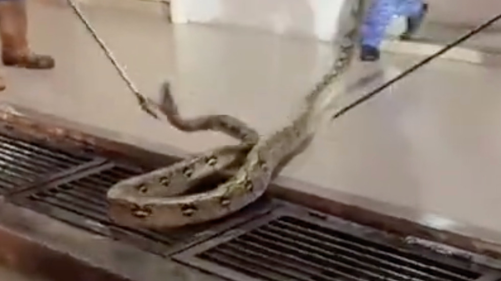 马来西亚洪水引发蛇患 一条巨蟒在积水街头游走