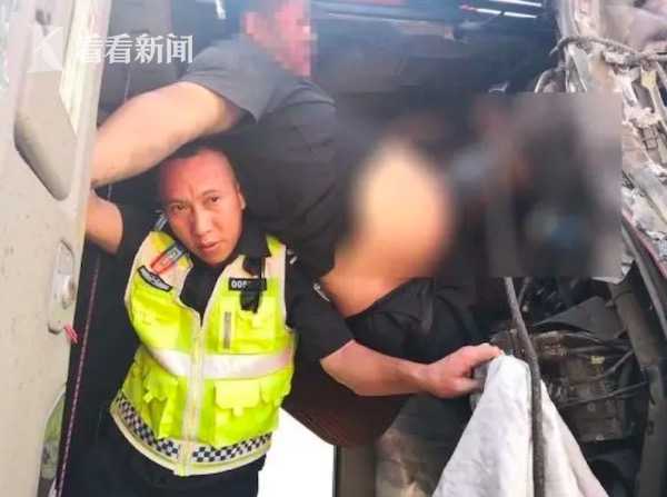 为了缓解驾驶人的痛苦,确保救援安全,交警胡锦文挤进狭小驾驶室内,用自己的肩膀将体重近两百斤的驾驶人托了起来。