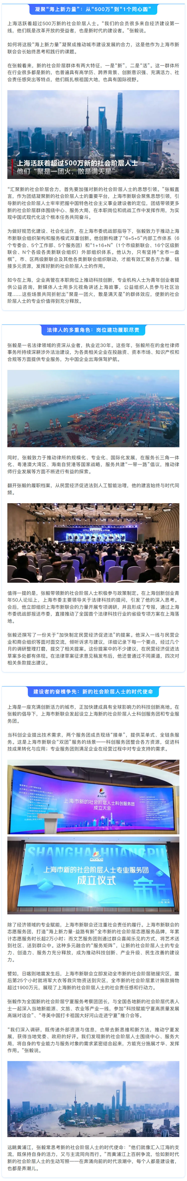 近日,中央统战部“统战新语”微信公众号专访上海市新的社会阶层人士联谊会会长张毅。在上海这座创新活力涌动的城市,张毅以多重身份努力工作——他是一名深耕法律行业近30年的专业人士,见证并参与法治中国的建设进程;亦是上海市新的社会阶层人士联谊会(以下简称“上海市新联会”)会长,致力于凝聚和服务上海全市数百万新的社会阶层人士。