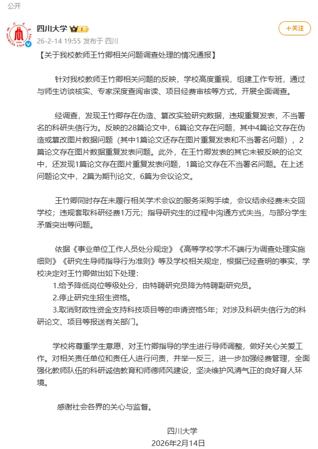 2月14日晚,四川大学发布通报:针对我校教师王竹卿相关问题的反映,学校高度重视,组建工作专班,通过与师生访谈核实、专家深度查阅审读、项目经费审核等方式,开展全面调查。