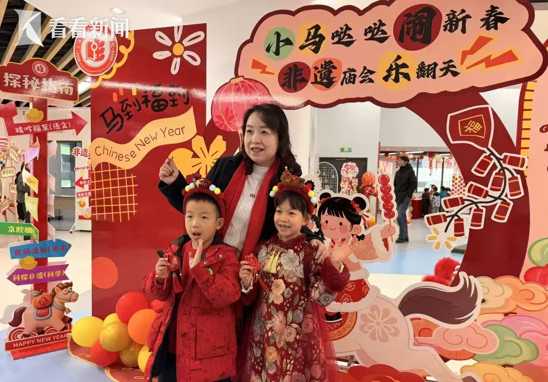 1月20日,上海民办华曜宝山实验学校校园化身“非遗新春庙会”,一、二年级全体学生身着红装,手提“小马集福卡”,在AI机器人、平板互动、智能香囊等“黑科技”陪伴下闯关集福,完成一场别开生面的“表现性评价”。这场名为“小马哒哒闹新春 非遗庙会乐翻天”的游园活动,把语文、数学、英语、音乐、体育、美术、科学七大学科核心素养,与京剧、剪纸、舞狮、香囊等非遗项目深度捆绑,实现“双减”背景下“学科融合+文化浸润+科技赋能”的低年级评价新样态。