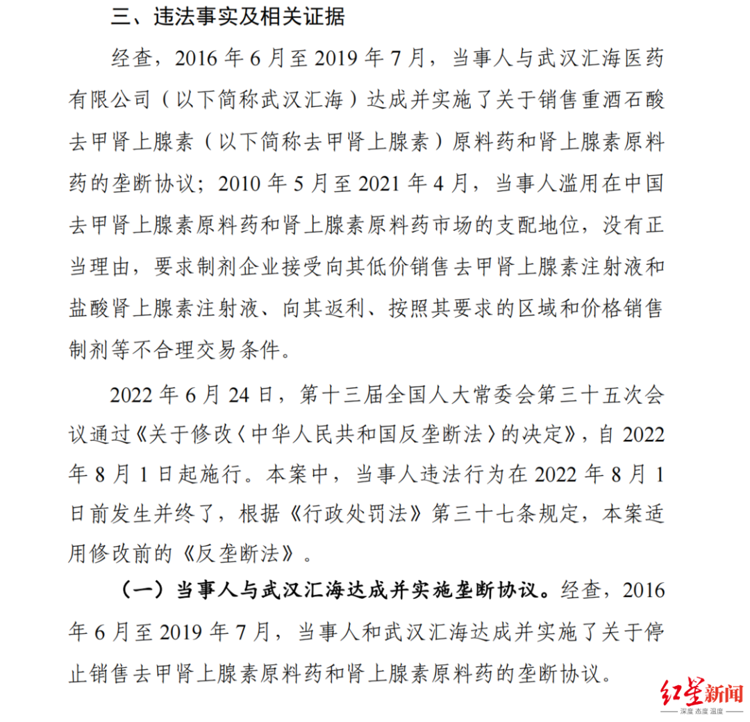 据国家市场监督总局的调查,2016年6月-2019年7月,远大医药与武汉汇海达成并实施了关于上述两种原料药的垄断协议:二者多次沟通后,于2016年6月达成口头协议,约定武汉汇海停止销售去甲肾上腺素原料药和肾上腺素原料药。