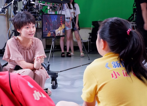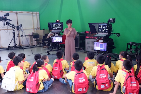 《新闻坊》主持人舒怡老师为小记者们进行“开播”前的讲解与指导。