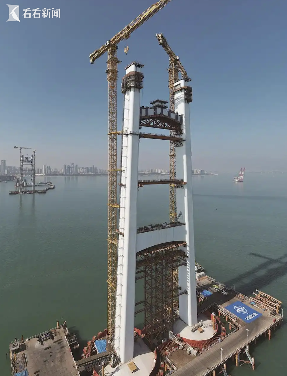 12月1日,厦金大桥厦门段关键控制性工程刘五店航道桥主塔顺利封顶。这一里程碑式进展,标志着大桥建设正式从“立塔成型”转入“悬索成桥”阶段,为后续主缆架设、钢箱梁吊装等核心工序筑牢基础。