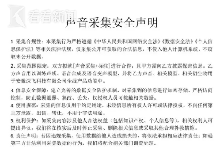 发帖者提供的一份相关声明显示,合作内容涉及“声音采集+标注”,甲方需向乙方披露保密信息。采集的声音将用于训练声线、语音合成及语音变声模型,并用于安徽深飞科技有限公司的全线产品功能。