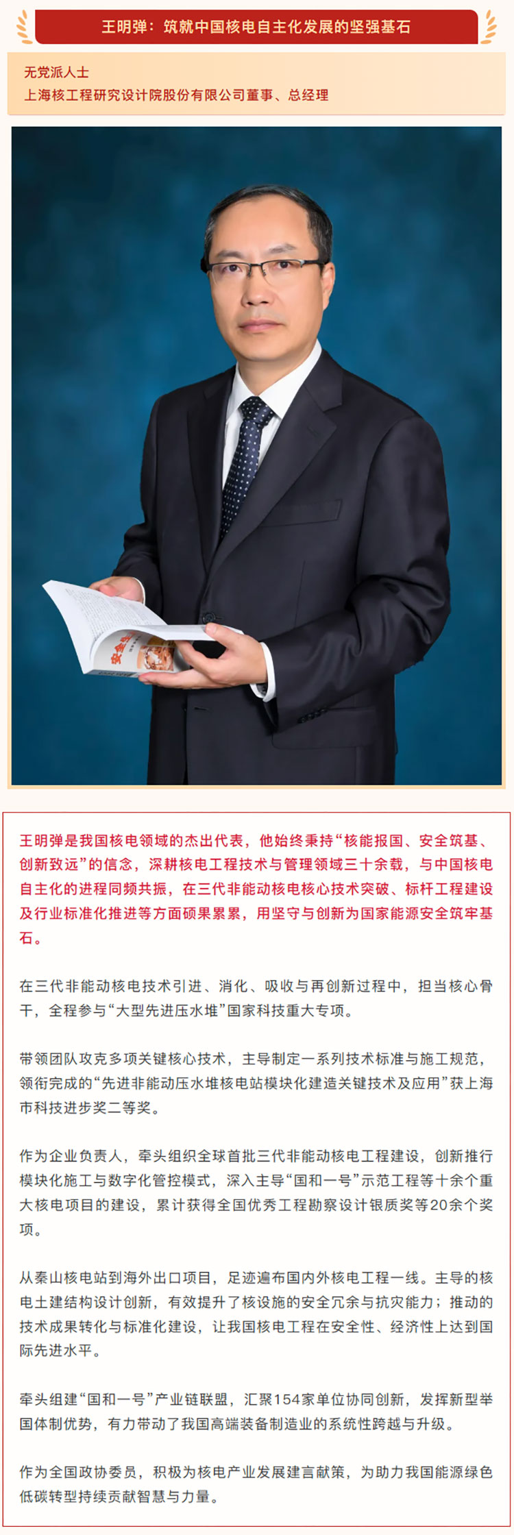 即日起,“浦江同舟”将为您逐一介绍这十位党外代表人士。本期,请看无党派人士,上海核工程研究设计院股份有限公司董事、总经理王明弹的事迹。