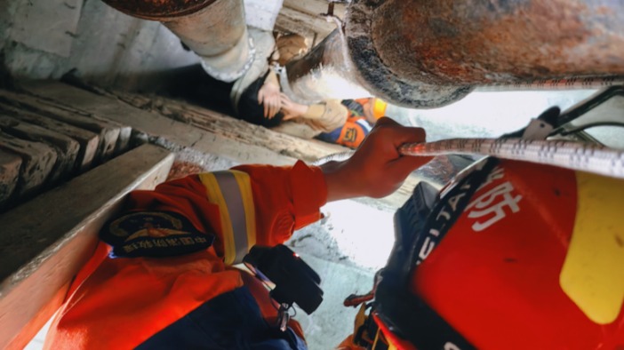 消防人员紧握抛下的绳索,经过近40分钟的攀爬,成功将被困司机救出,移交至现场120急救人员。