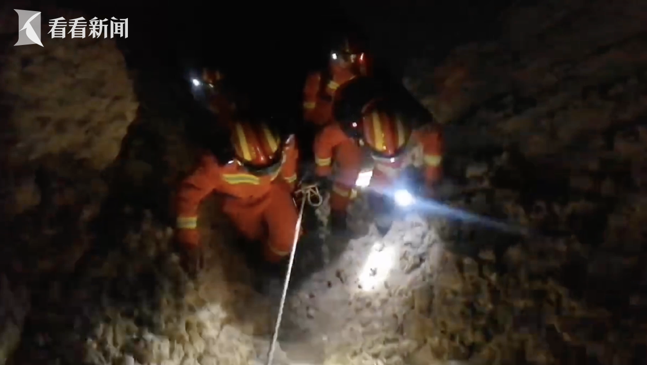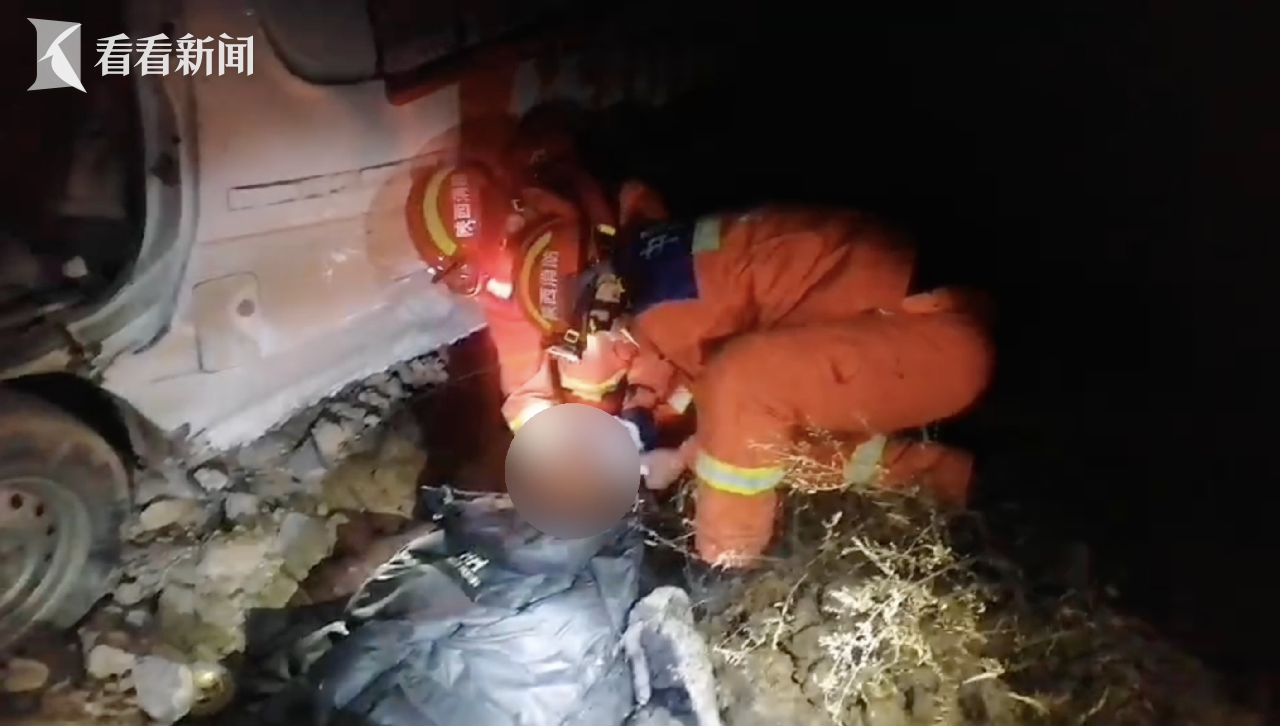 接到报警的陕西淳化县消防救援站消防员,携带救援担架深夜下至60米的沟底对受伤司机,进行头部初步包扎并对受伤腿部进行固定,利用担架将司机进行转移。