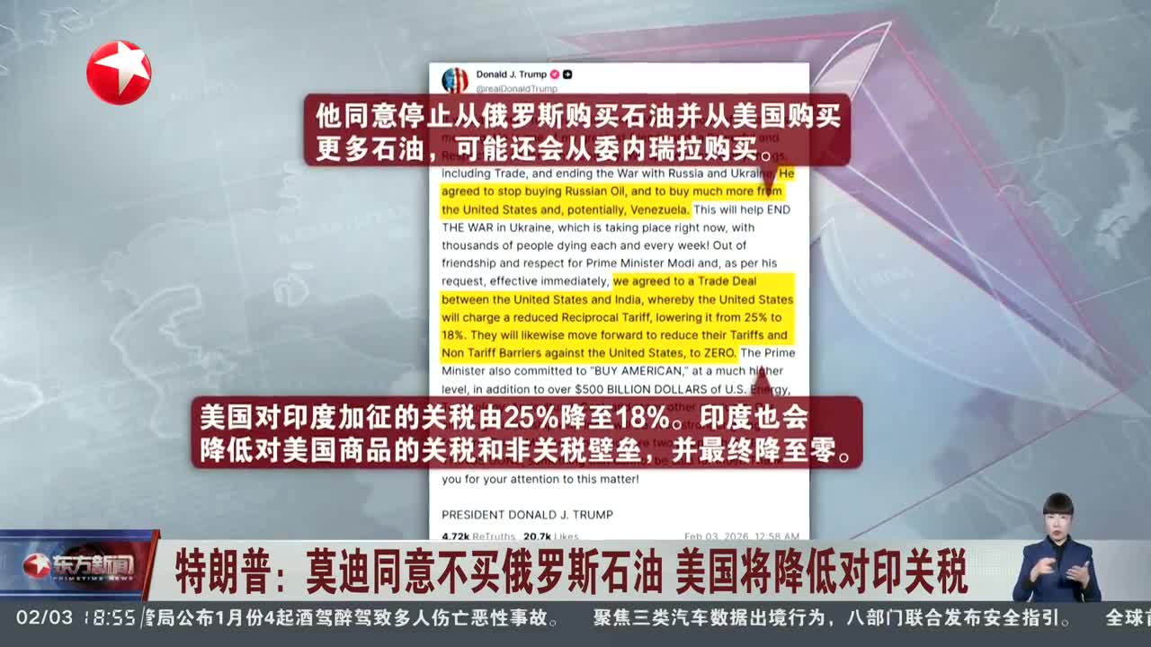 特朗普:莫迪同意不买俄罗斯石油 美国将降低对印关税