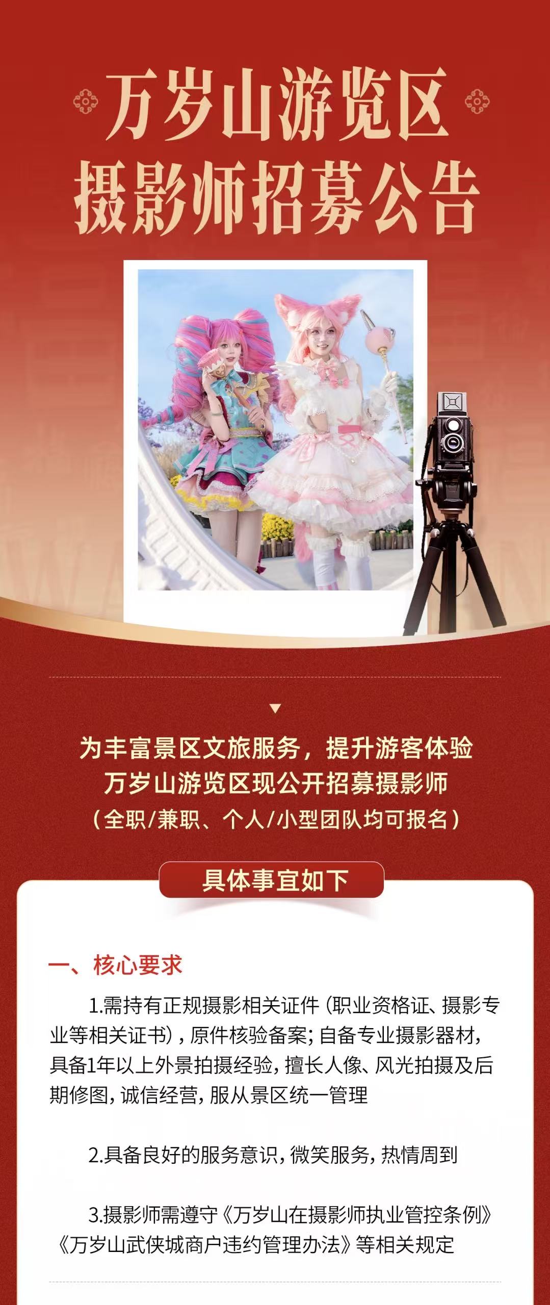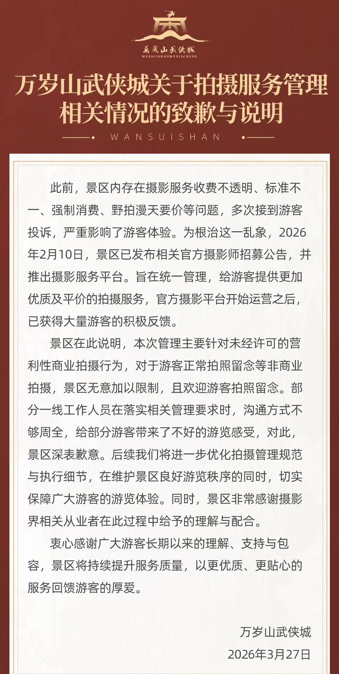 3月27日,万岁山武侠城发布致歉与说明:景区此前出台相关管理规定,是为整治摄影服务不透明、强制消费、野拍漫天要价等乱象,管理仅针对未经许可的营利性商业拍摄,并不限制游客正常拍照留念。此次事件中,一线工作人员落实要求时沟通方式不够周全,给游客带来不佳体验,景区就此深表歉意。后续将优化管理规范与执行细节,兼顾游览秩序与游客体验。