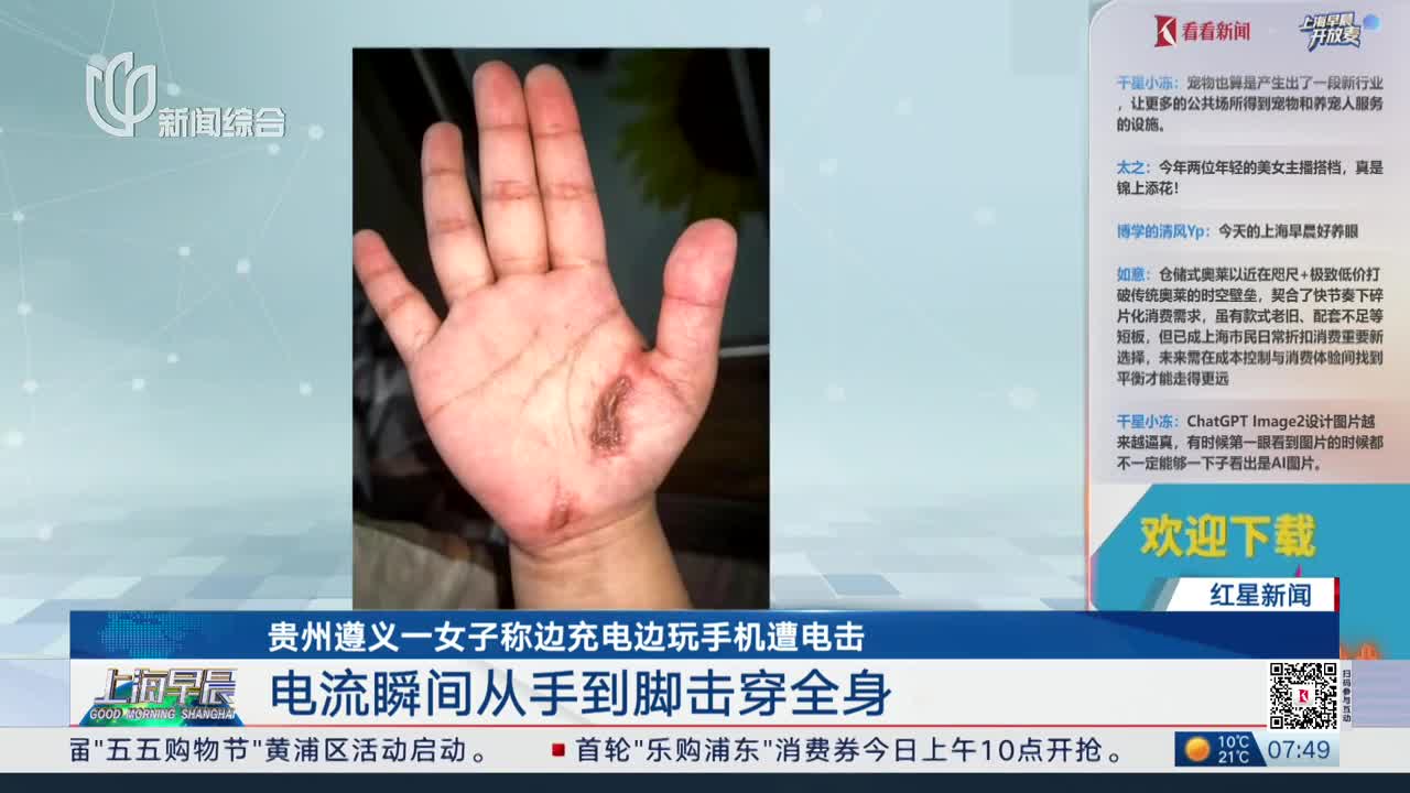 贵州遵义一女子称边充电边玩手机遭电击 电流瞬间从手到脚击穿全身