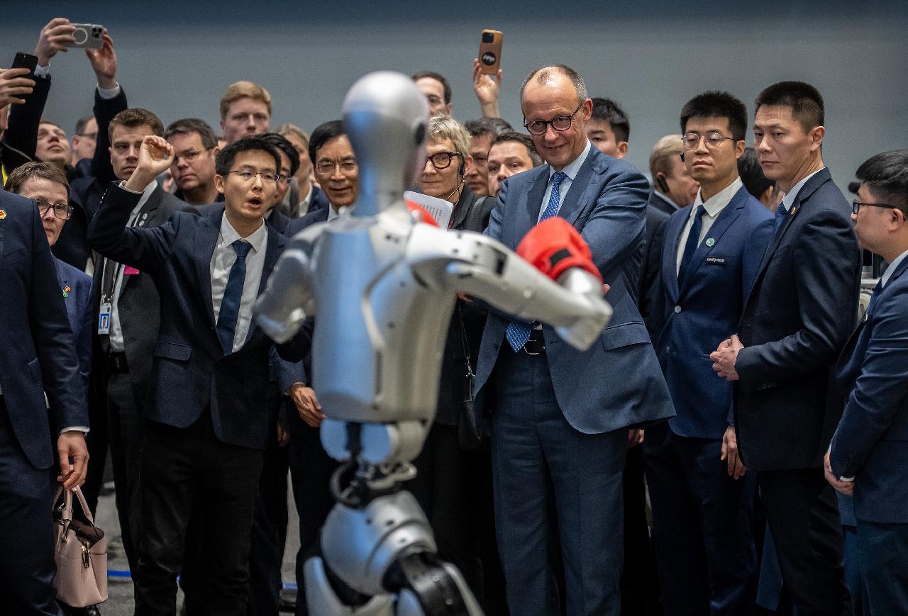 人形机器人不仅“返场”表演了今年春晚上的《武BOT》,还现场上演了一场格斗对决,默茨看得是津津有味,好奇、惊叹,都写在了他的眼神里;参访中,他还拿起机器人零部件仔细查看,颇有兴致。现场,几位德企高管直接和人形机器人手拉手跳起舞来、合影留念,玩得相当尽兴。“今天一共参观了宇树机器人等三家企业,再次亲眼目睹了产品的高质量和科技的高水平。”默茨说。