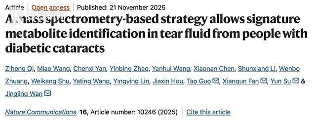 上海交通大学医学院附属第九人民医院眼科苏蕴副研究员、范先群教授、郭涛主任医师与华东师范大学万晶晶教授团队合作,开发了一种基于纳米颗粒增强激光解吸电离质谱(NELDI-MS)的新方法,仅需10纳升(nL)泪液,在30秒内即可实现对糖尿病性白内障的精准、无创诊断,并成功揭示了糖尿病性白内障在眼表与眼内独特且密切相关的代谢重编程规律。