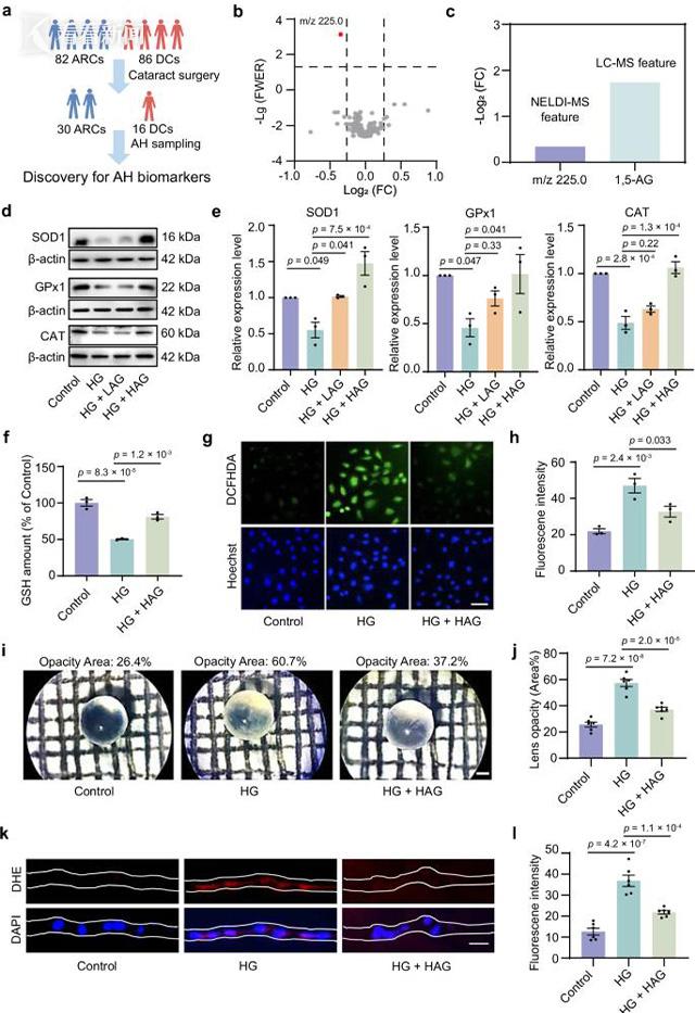 该研究深入探索糖尿病性白内障的发生机制。为了对NELDI-MS筛选出的关键代谢特征进行精准鉴定,团队创新性提出了基于痕量样本的快速二维信息特征匹配策略,成功将泪液中的诊断标志物注释为甘油-3-磷酸、9,10-DHOME、12,13-DHOME和N-乙酰神经氨酸。这些代谢物与能量代谢、炎症和氧化应激密切相关。通过对匹配的房水样本进行分析,团队在眼内发现了1,5-脱水葡萄糖醇作为糖尿病性白内障的生物标志物。相关性分析表明,眼表泪液与眼内房水的代谢紊乱虽不相同,但密切相关。进一步的细胞和离体晶状体实验证实,1,5-脱水葡萄糖醇能够通过上调抗氧化酶水平,显著减轻高糖诱导的晶状体氧化应激和混浊,发挥了保护作用。这揭示了1,5-脱水葡萄糖醇水平降低可能是糖尿病性白内障发生发展的重要环节。