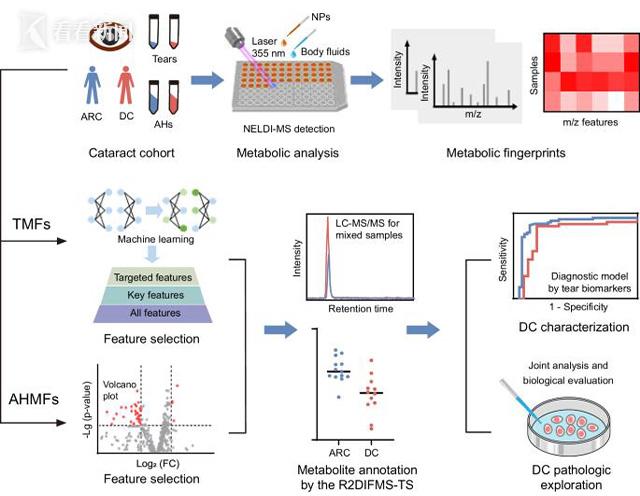该研究将高性能NELDI-MS技术与机器学习相结合,首次实现了基于痕量泪液代谢指纹的糖尿病性白内障无创诊断,并建立了连接泪液与房水的代谢研究新策略,为疾病机制探索提供了新视角。