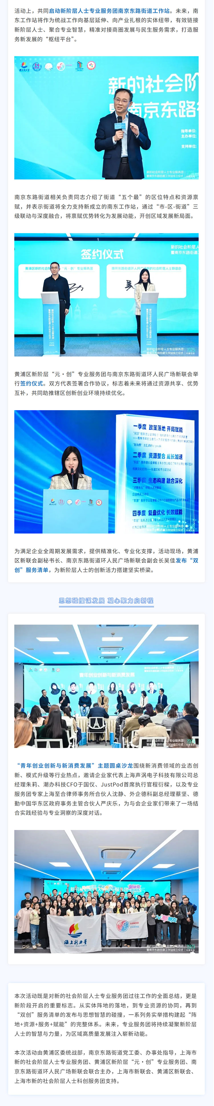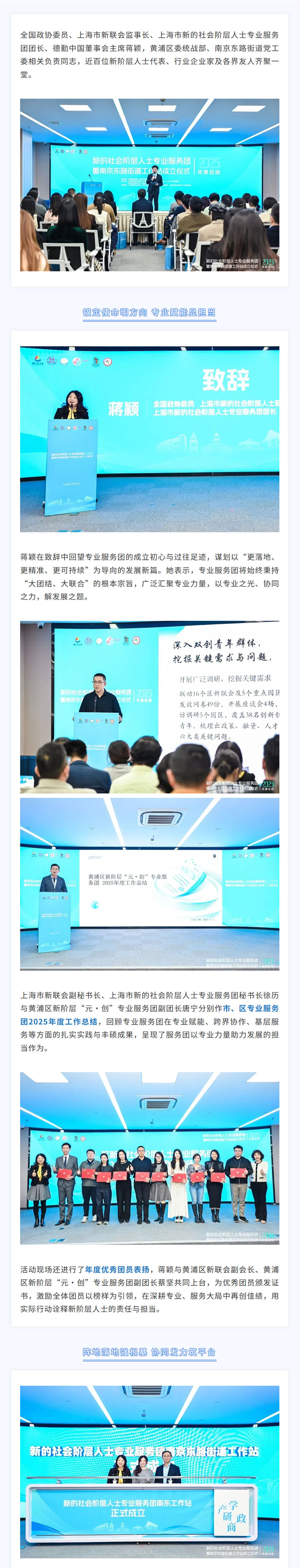 11月27日下午,上海市新的社会阶层人士专业服务团2025年度总结暨南东工作站成立仪式在南京东路街道广场驿党群服务中心举行。