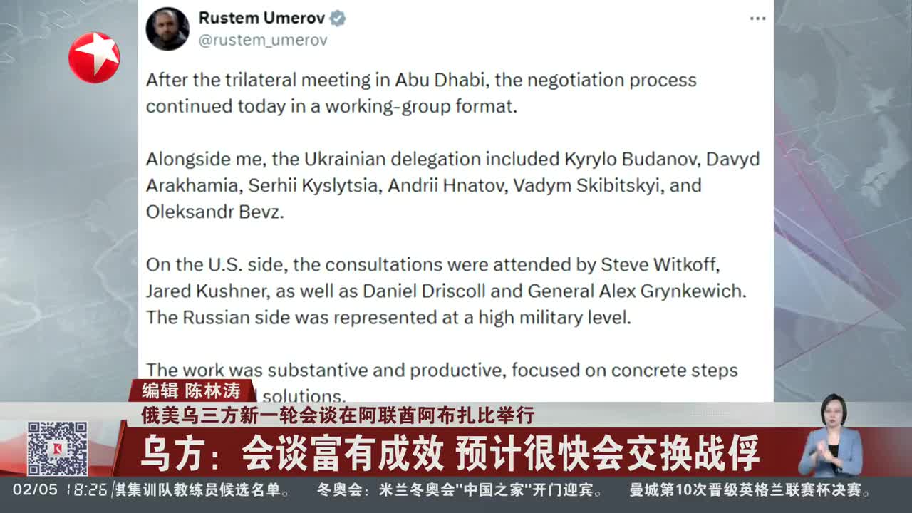 由俄罗斯、美国、乌克兰三国代表组成的安全问题工作组4日在阿联酋首都阿布扎比举行新一轮会谈。乌克兰国家安全与国防委员会秘书乌梅罗夫4日表示,当天在阿布扎比举行乌美俄三方会谈后,谈判进程继续以小组形式进行。他表示,本轮会谈内容充实、富有成效,重点关注具体行动和实际解决方案。