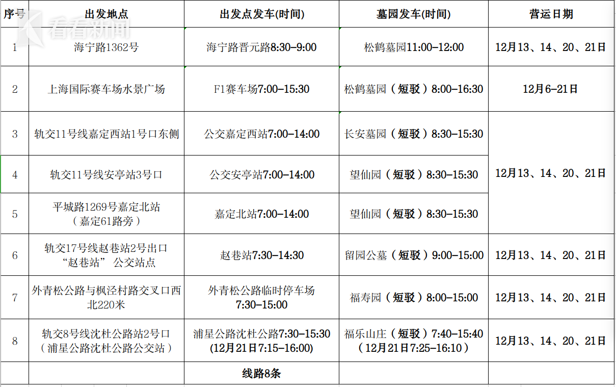 为方便市民冬至期间祭扫,从12月13日起,本市将开通8条冬至定点扫墓班车,具体线路营运安排见下图。