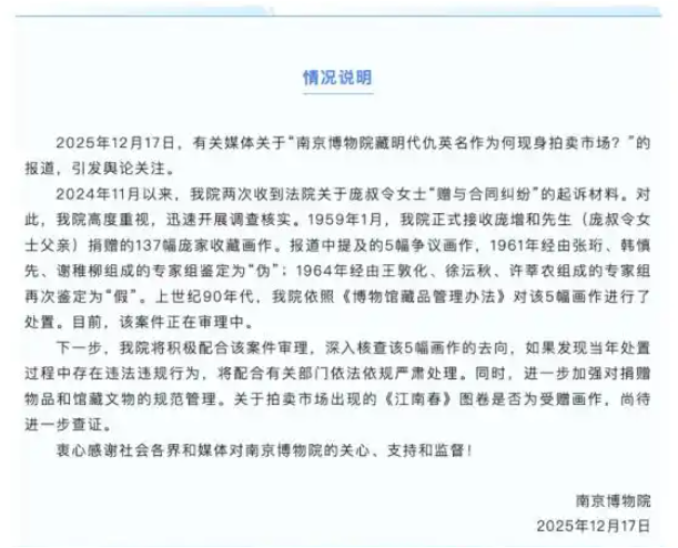 南京博物院在“情况说明”中回应称,经调查核实,该馆于1959年1月正式接收了庞氏后人庞增和,也就是庞叔令父亲捐赠的137幅庞家收藏画作。但在1961年和1964年,包括《江南春》图卷在内的5幅庞氏捐赠画作,都在专家组的鉴定中被定性为“伪作”。上世纪90年代,南京博物院依照《博物馆藏品管理办法》对这5幅画作进行了处置。南博同时表示,将深入核查这5幅画作的去向。如果发现当年处置过程中存在违法违规行为,将配合有关部门依法依规严肃处理。此外,关于拍卖市场出现的《江南春》图卷是否是受赠画作,还有待进一步查证。