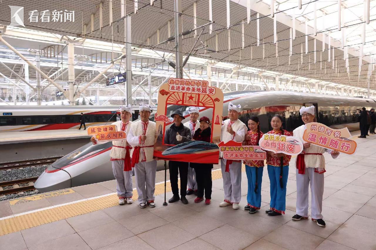 早上10点整,西延高铁C9312缓缓驶出西安北站。列车上洋溢着喜庆的气氛,车窗玻璃上贴着陕北剪纸、陕北二人转和安塞腰鼓响彻车厢。
