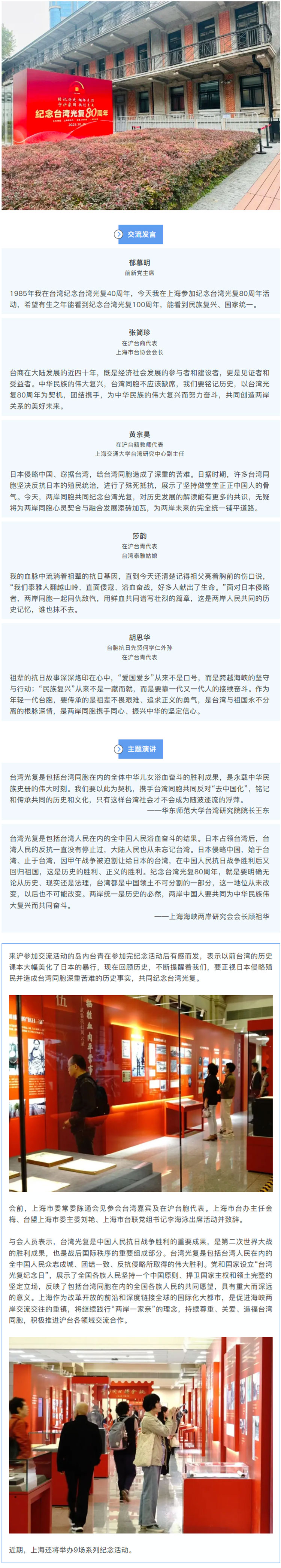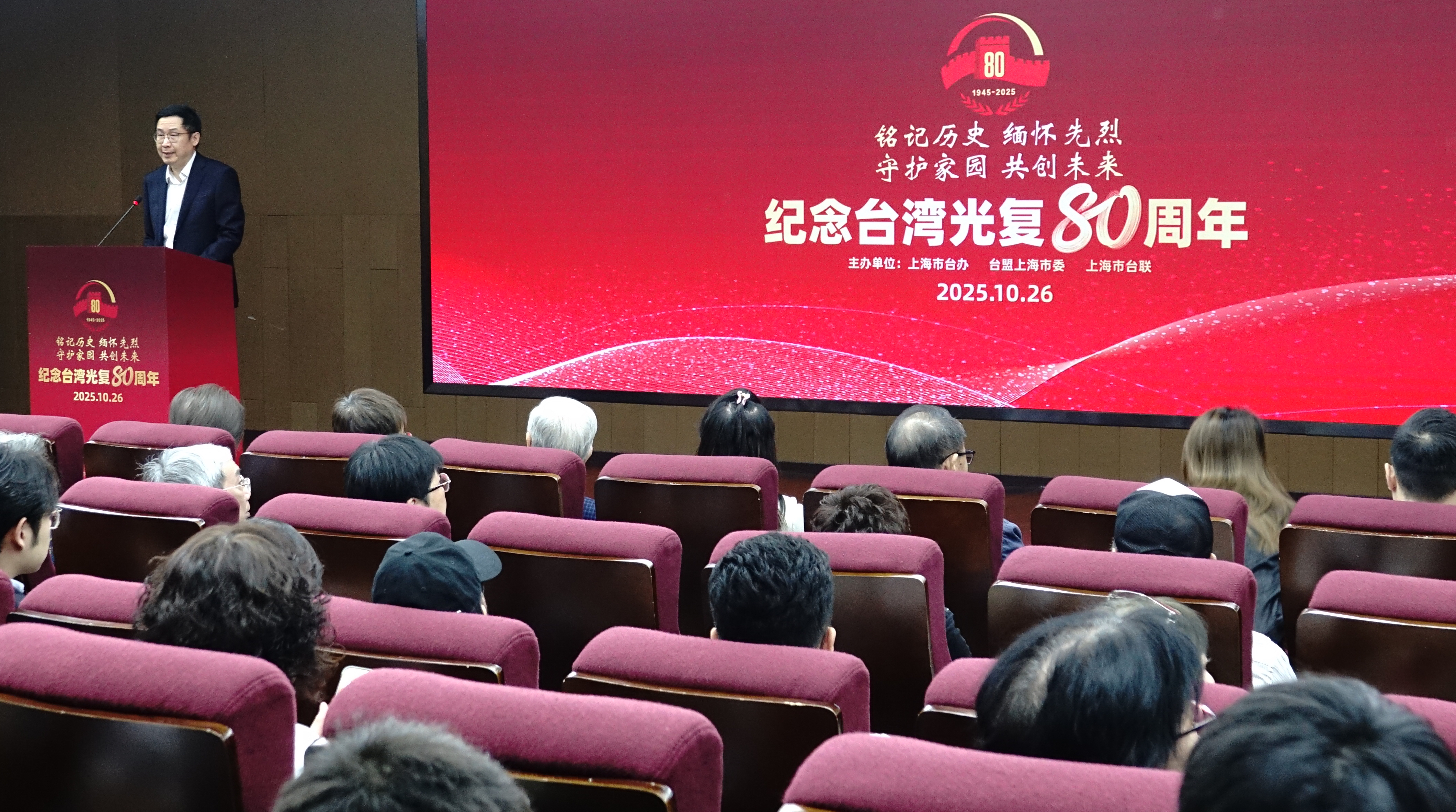 10月26日,为强化两岸同胞共同民族历史记忆,推动反“独”促统大业,上海市台办、台盟上海市委、上海市台联在上海历史博物馆共同举办纪念台湾光复80周年主题纪念活动。在沪台商台胞台青等代表人士、抗日志士后代及来沪参加交流活动的台湾青年等近百人共聚一堂,共同铭记抗战历史,纪念台湾光复,共创祖国统一和民族复兴的美好未来。