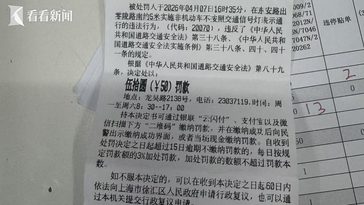 2026年4月7日16时35分许,徐汇交管支队机动大队民警朱杰珂带领辅警设卡整治期间,通过“视频+实兵”巡逻模式,发现一快递小哥汤某某在东安路零陵路口有闯红灯的违法行为,遂在中山南二路东安路口予以拦停查处,对其依法进行罚款50元处罚。