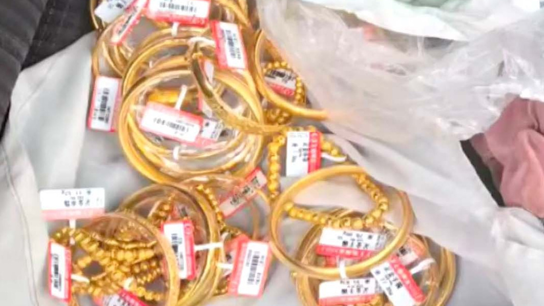 警方锁定了该名男子,他是五公里外的一家沿街店铺店主的老公。案发后10个小时,警方将男子抓获,并追回了包括24个金手镯、10条金手串在内的,总共54件,830克涉案赃物。