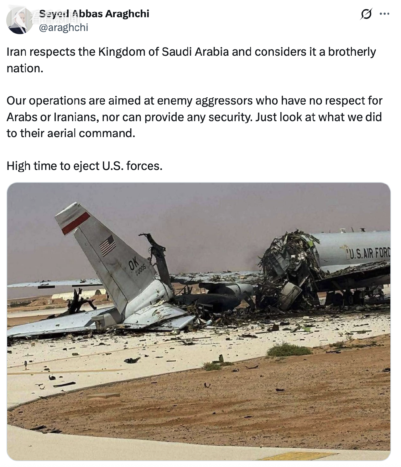 3月29日,伊朗发动导弹和无人机袭击,打中沙特苏丹王子空军基地一架美军预警机。阿拉格齐发布该军机严重受损的照片解释说,伊朗的目标是那些不尊重阿拉伯人、伊朗人、也提供不了任何安全保障的“敌人”。