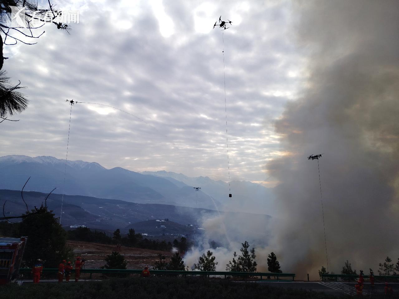 在抵达火场,经勘察火情后,雅安大队大队长张国胜果断下达命令,多维度协同灭火攻坚战由此打响。在无人机携灭火弹精准压制明火、吊桶输水同时,常规分队携风力灭火机向火头推进,与空中形成立体夹击。现场快速架设串联水泵、构建输水网络,高压水流精准浇灭余火,还调派了水罐车、铺设水带干线供水,在火场西侧架设水囊开展增湿作业,构筑起30米宽水浇隔离带,严防飞火形成新火场。总攻期间,通信、气象等保障力量同步发力。