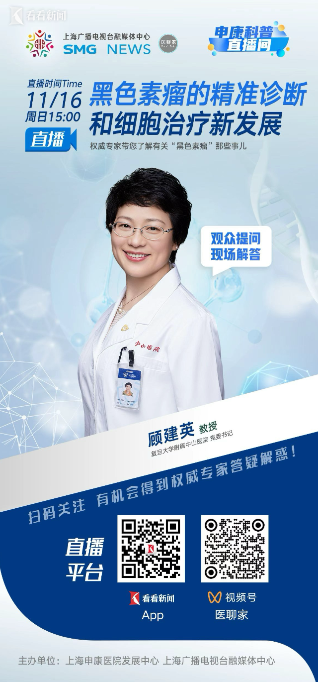 黑色素瘤是一种源自皮肤黑色素细胞的高度恶性肿瘤,具有早期易转移、进展迅速、死亡率高等特点。传统的手术切除、化疗及放疗在中晚期患者中疗效有限,而近年来精准诊断技术与细胞治疗的突破,为黑色素瘤的治疗带来了新的希望。通过分子分型、基因测序等精准检测手段,可以实现靶向药物的个体化选择;而T细胞免疫疗法、肿瘤疫苗等细胞治疗策略,则在延长患者生存期、改善生活质量方面展现出显著潜力。本期节目,我们邀请到复旦大学附属中山医院党委书记顾建英教授做客直播间。