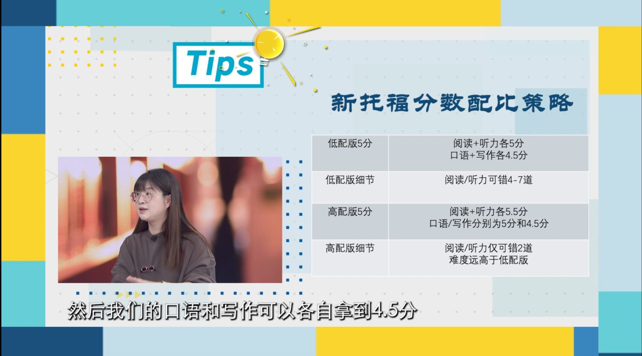 如果你的目标是总分5分,你可以选择“低配版”——阅读听力各5分(可错4-7题),口语写作各4.5分(口语23-24分、写作21-23分)。四项平均4.75分,四舍五入,5分到手。